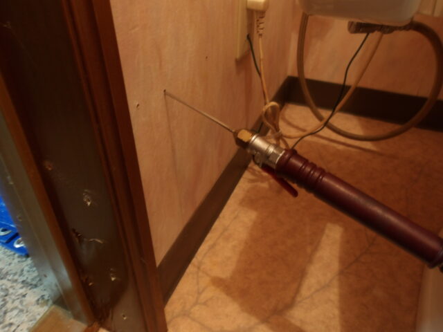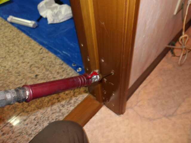 某事業所のトイレ枠がシロアリの被害に遭いました。穿孔処理し、薬剤を注入。ご相談ください。