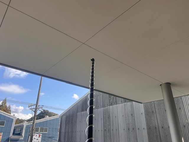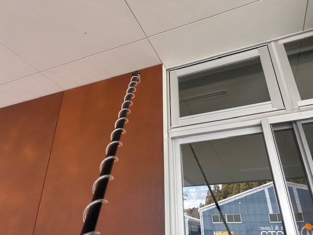 クモ駆除の様子です。特殊ノズルで4mまでの施工が可能です。安全に安価に作業ができます。ご相談ください。